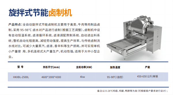 全?動旋拌式節(jié)能?制機主要?于禽類、??等?制品?制,采? 95-98 °C ??對產品進??制(根據(jù)?藝調整),?制機中設有?動恒溫系統(tǒng)、?液循環(huán)系統(tǒng)、?液調配熬制系統(tǒng)、?動進出料系統(tǒng);整機?動化程度?,減輕勞動強度,提??產效率,與傳統(tǒng)?制流?線對?,可減少?量蒸汽、?液、??料等?產損耗,并可實現(xiàn)單機?產量使 ?、多機連續(xù)式?產量?產,機動性強,適?于?中?型企業(yè)。
